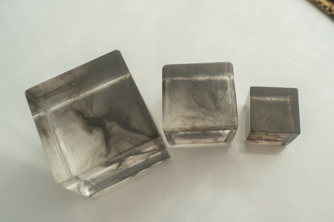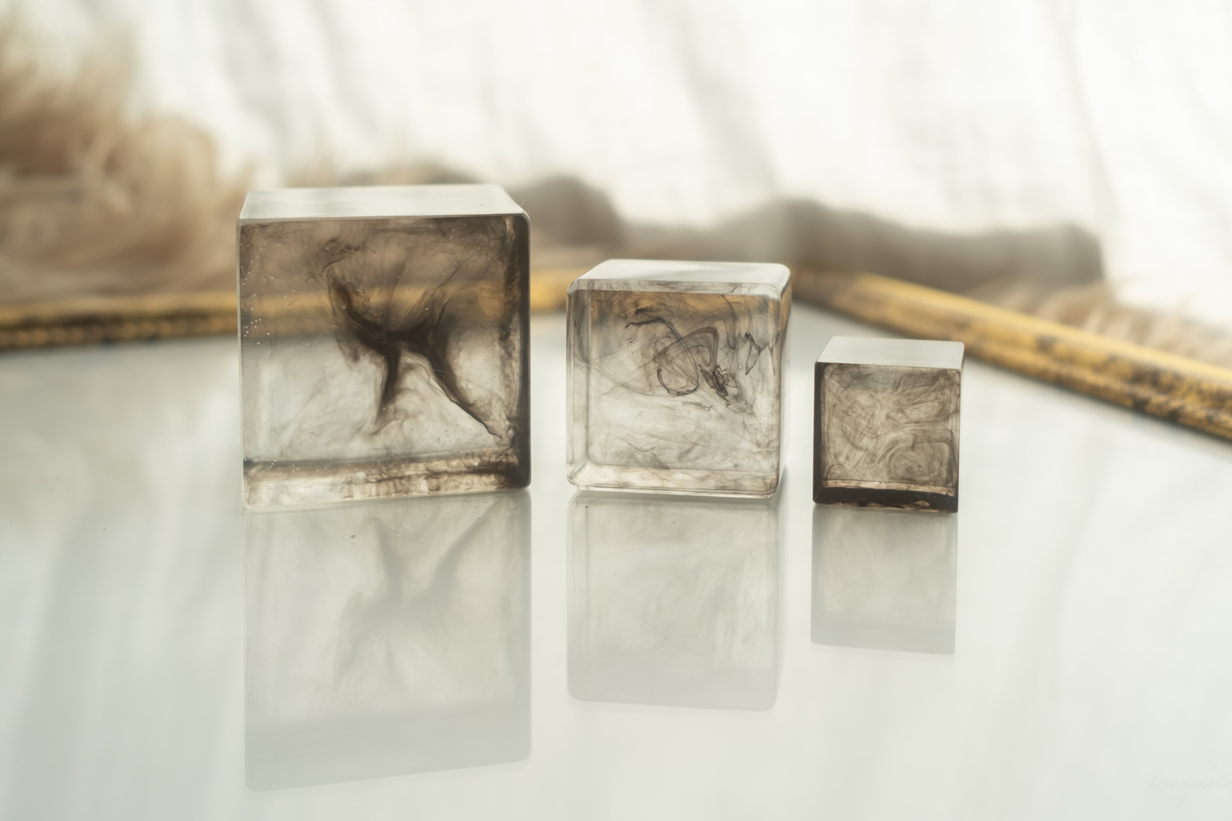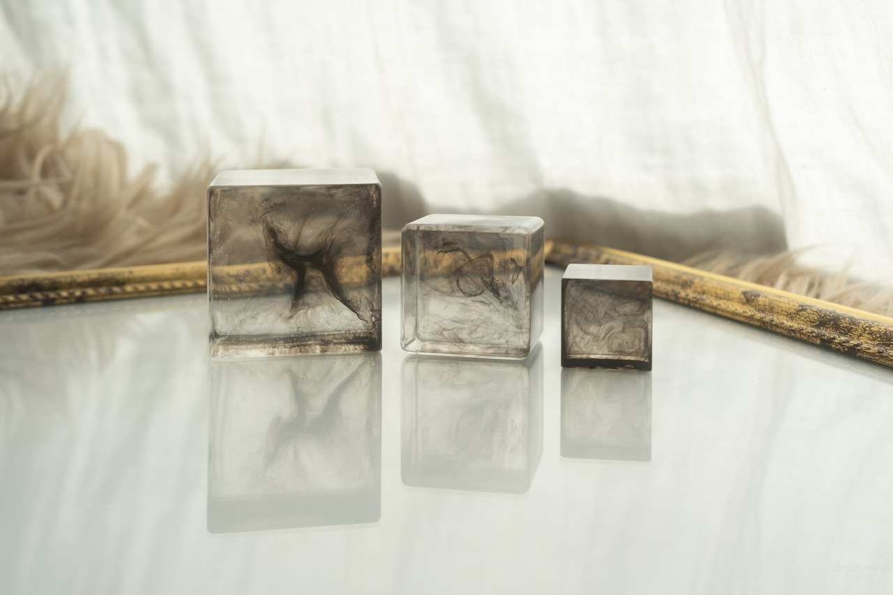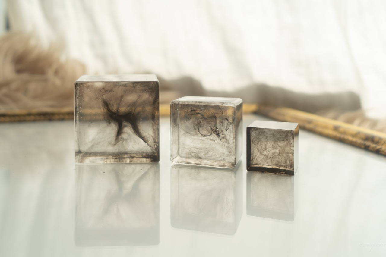 エポキシレジンの中に、黒インクを閉じ込め”陰陽”を表したアートオブジェです。